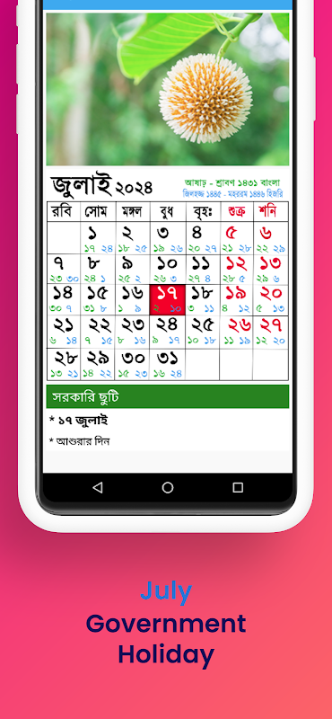 সরকারি ছুটির বাংলা ক্যালেন্ডার অ্যাপটি দেশের সরকারি ছুটির দিন উপস্থাপন করে।