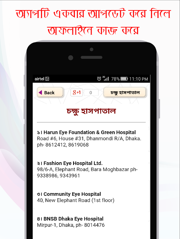 One can search the internet and get information about causes, symptom and how to prevent those diseases. Along with that you will get contact details (such as address, phone number etc) of hospital in Bangladesh to make immediate contact with hospital in your nearest area or any other area in Bangladesh. But for that you must have an computer or smartphone with internet connection. But in this app you’ll have access these online information offline.