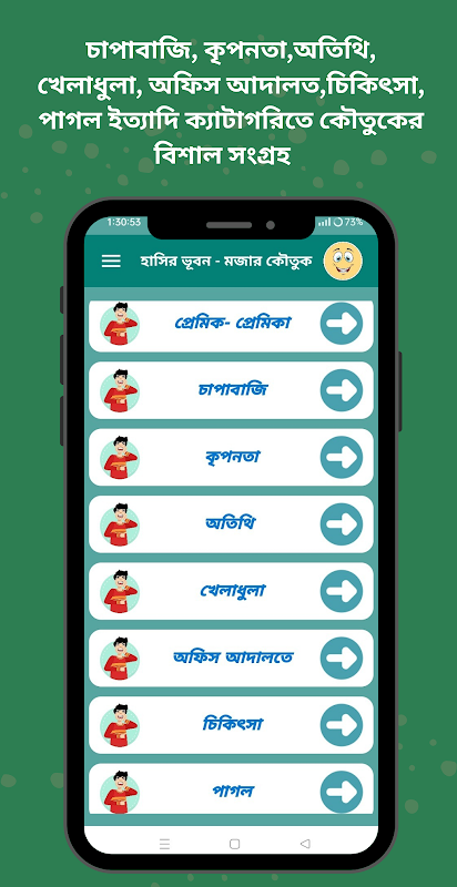 Nosso lindo aplicativo de piadas bengalis Hasir Bhuban - piadas engraçadas são organizadas com as melhores piadas selecionadas. Como pessoas que falam bengali, quase todos nós gostamos de ler piadas engraçadas em bengali. Em nossa vida agitada, quando estamos cansados devido à pressão do trabalho ou a ambientes diferentes, diferentes pessoas tentam diferentes maneiras de aproveitar ou obter prazer, como algumas pessoas tentam trazer alegria e paz lendo piadas bengalis em diferentes mídias on-line ou aplicativos off-line. Muitas vezes gostamos de deixar os outros felizes contando piadas em diversos chats ou eventos com amigos. Nosso aplicativo Hashi Bhuvan - Funny Jokes é apenas para quem gosta de piadas engraçadas.