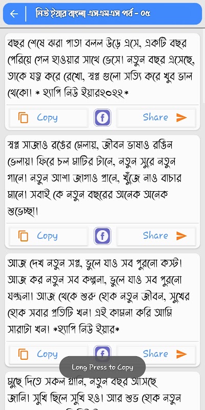 হেপি নিউ ইয়ার ২০২২ এপ্লিকেশনটির মাধ্যমে আপনি আপনার পিয়জনদের হেপি নিউ ইয়ার এসএমএস এবং হ্যাপি নিউ ইয়ার 2022 এর বাণী সহ এখান থেকে আপনি আপনার পছন্দ অনুযায়ি New year sms বেছে নিয়ে যেকোনো সামাজিক যোগাযোগ মাধ্যমে সরাসরি happy new year status পোষ্ট করতে পারবেন অথবা কপি করেও সেন্ড বা শেয়ার করতে পারবেন।