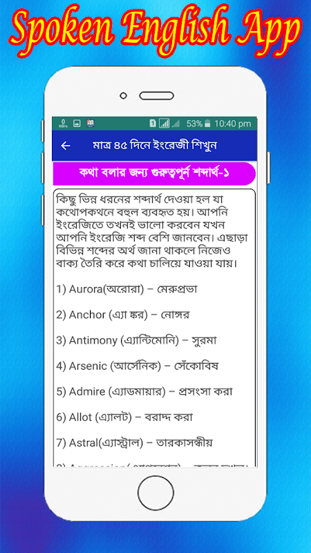 ইংরেজী জানা আমাদের সকলের জন্যই অত্যন্ত প্রয়োজনীয়। জীবনের প্রতিটি ক্ষেত্রেই আমাদের ইংরেজীর সম্মুখীন হতে হয়। এখনকার সময়ে ভালো একটা চাকরি পেতেও ইংরেজীতে দক্ষ হতে হয়। তাই আপনাদের ইংরেজীর ভয় দূর করার জন্য আমরা মাত্র ৪৫ দিনে ইংরেজী শিক্ষার ফুল কোর্স নিয়ে এসেছি। আশা করি আমাদের অ্যাপটির মাধ্যমে মাত্র ৪৫ দিনেই ইংরেজীতে দক্ষ হয়ে উঠতে পারবেন। অনেকে মনে করে যে ইংরেজীতে কথা বলা কোন সহজ কাজ নয় এর জন্য অনেক বড় বড় কোর্স করে গ্রামার শিখতে হবে অনেক শব্দার্থ শিখতে হবে। আমি তাদের বলতে চাই ইংরেজিতে কথা বলার জন্য কোন গ্রামারের প্রয়োজন হয় না। মাত্র ৪৫ দিনেই ইংরেজিতে কথা বলতে চান তাহলে প্রত্যেকটি ক্লাসে ২দিন করে সময় দিবেন । ক্লাস গুলো খুবই সহজ পদ্ধতিতে সাজানো হয়েছে যাতে আপনারা সহজেই বুঝতে পারেন।