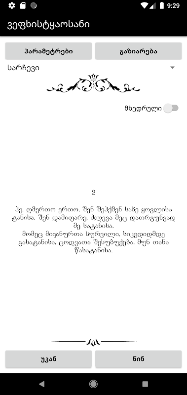 Livro - O aplicativo contém o texto georgiano moderno completo de Vepkhistkaosni, também é possível alternar para o texto Asomtavruli e retornar para Mkhedruli a qualquer momento.
