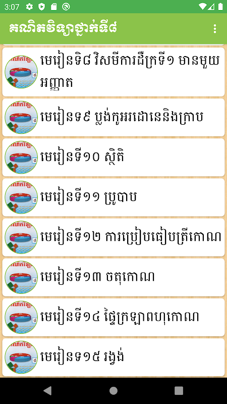O Math 8 é um programa do Ministério da Educação, Junior e High School do Camboja. Existem lições: