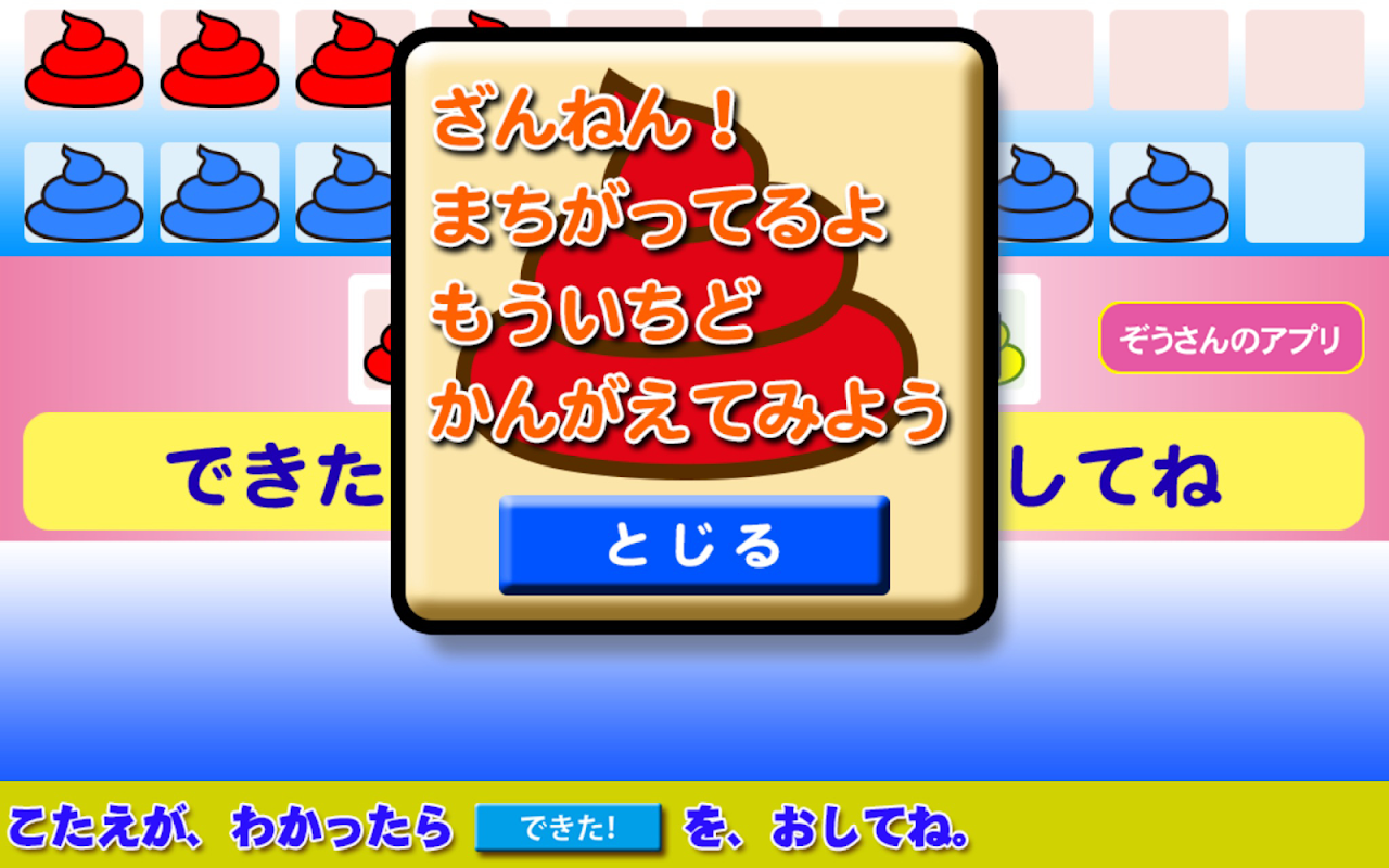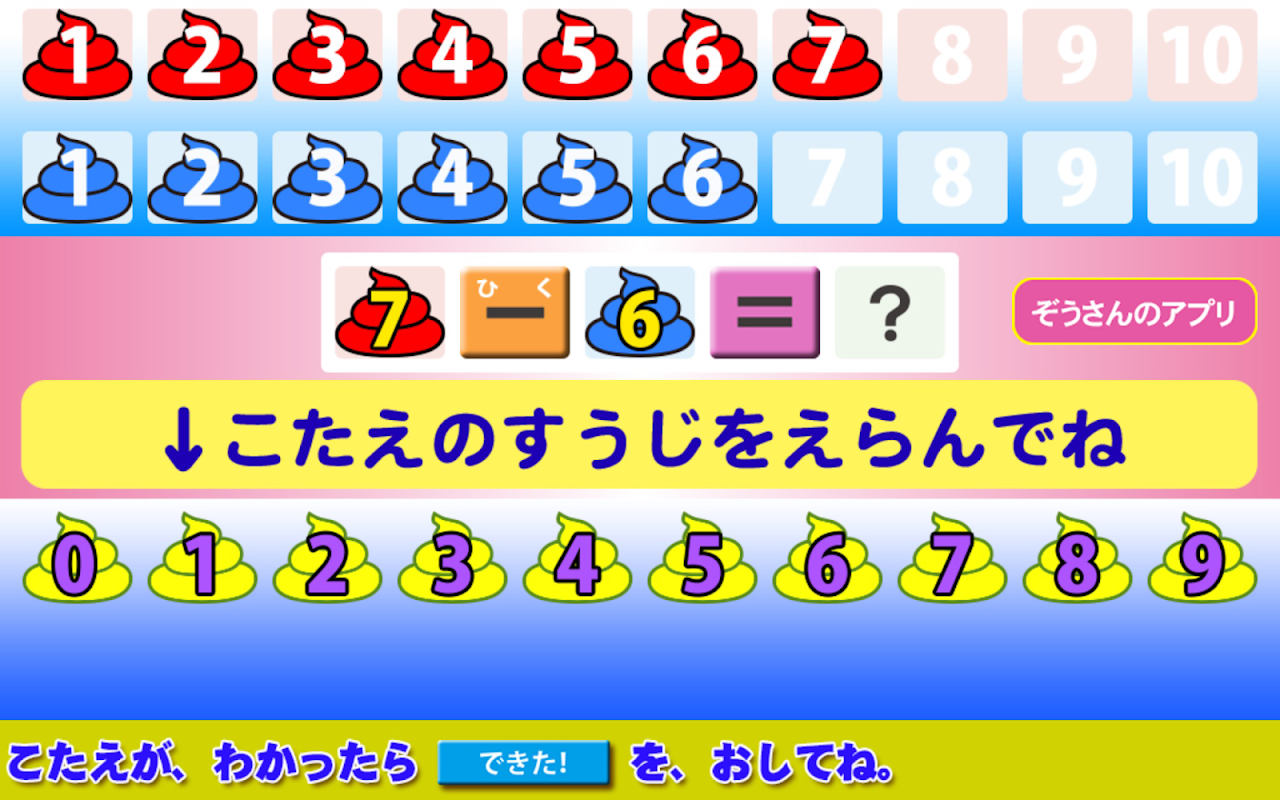 うんこの数を数えて算数のお勉強。足し算引き算を楽しんでお勉強できます。