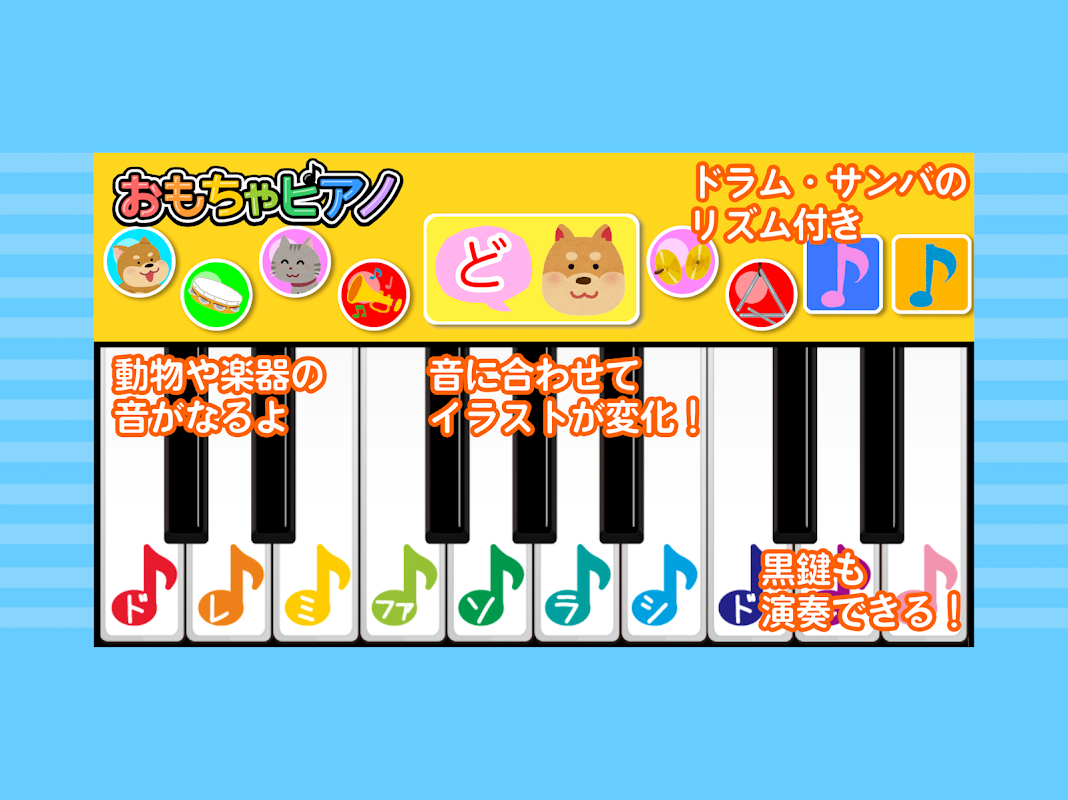 ■スマホがピアノに!無料の音楽・知育アプリ ■「ワンワン」などの効果音や、リズム再生付き。 ■音と一緒にイラストが変化!飽きずにお楽しみいただけます。