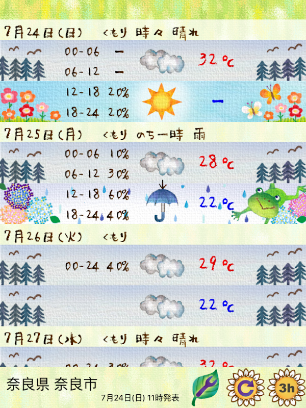 当日(夕方以降は翌日)の概要天気と最高・最低気温が表示されます。