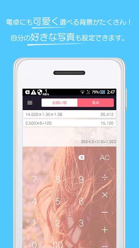 Calc wear for Androidはかわいいと、おしゃれをコンセプトにした計算機で、お買い物時と、日常の計算時とで、モードを切り替えて使う事が出来ます。