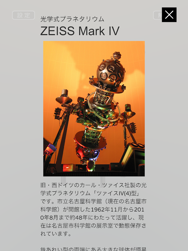 Este é um planetário óptico "Zeiss IV (4)" fabricado pela Carl Zeiss, uma antiga empresa da Alemanha Ocidental. Esteve ativo por cerca de 48 anos, desde novembro de 1962, quando o Museu de Ciências da Cidade de Nagoya (atualmente Museu de Ciências da Cidade de Nagoya) foi inaugurado, até agosto de 2010, e atualmente está preservado em um estado dinâmico na sala de exposições do Museu de Ciências da Cidade de Nagoya.