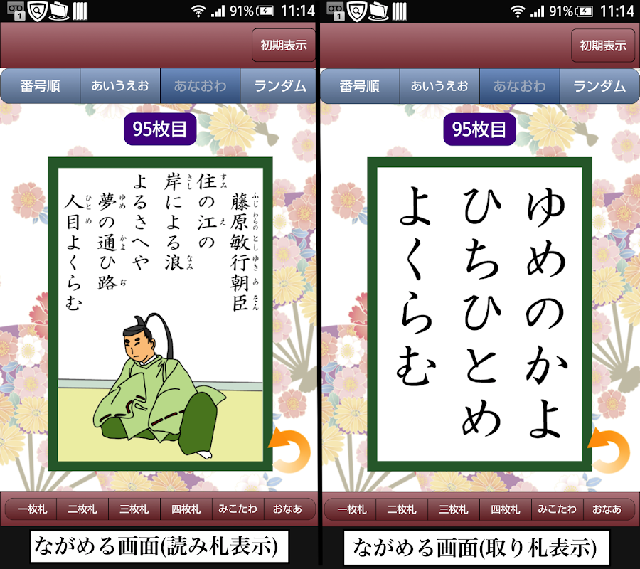このほか「ながめる」機能を使うと、札を覚えるための「札落とし」練習ができるようになっています。競技かるたを始めたばかりの初心者の方のトレーニング用にもおすすめです。
