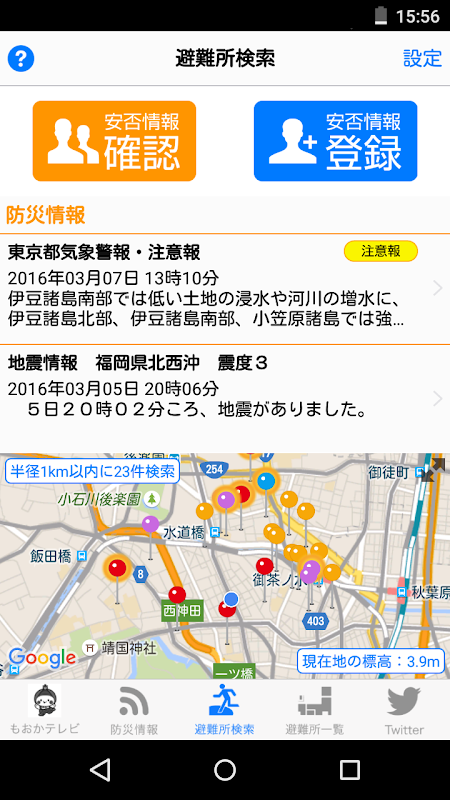 「安否登録」や「安否確認機能」も有していますので、災害に備えての事前確認や災害時における避難所検索に役立ちます。