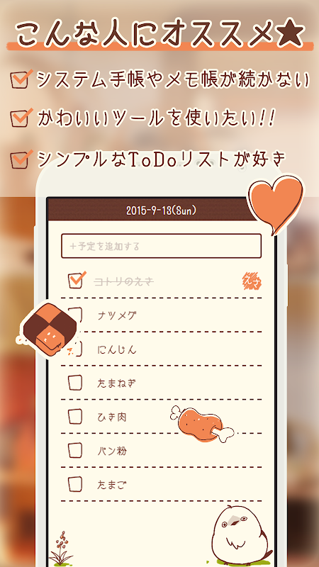 Simples e fácil de usar! Engraçado bonito ToDo lista · lembrete app para meninas! Você pode gravar horários e horários! Kotori é fofo e viciante!