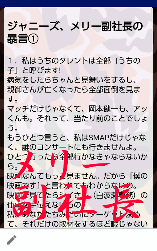 SMAP、国民的アイドルで何十年に一度というビッグな存在(でした)この稀有な存在を実質的に殺したのがジャニーズのメリー副社長。その裏付けの暴言集。