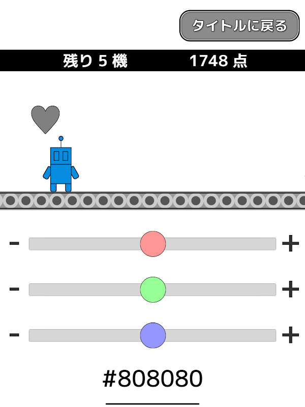 あなたの色彩センスが丸わかり!ベルトコンベアに乗って流れてくるロボットの色にあわせて、パネルを操作して同じ色になるように、カラーコードを調整しよう!
