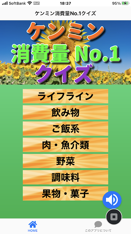 ジャンルとしては、ライフライン、飲み物、ご飯系、肉・魚介類、野菜、調味料、果物・菓子の7種類で、それぞれ7~9問あります。