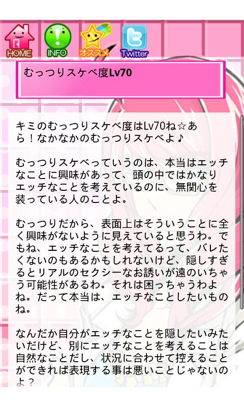に答えるだけで、日常生活での現実と妄想に隠れた『あなたのエッチ度』の傾向・対策を易しく、リアルに診断してくれますよ。