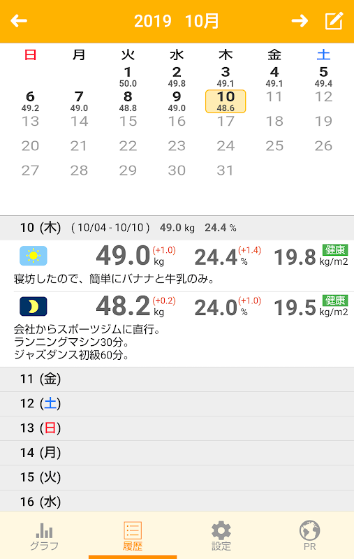 Comer demais, beber demais, peso que te interessa ... Primeiro, vamos continuar por 2 semanas. Exibição gráfica de peso, proporção de gordura corporal e IMC! Todas as funções, como entrada pela manhã e à noite e pressão arterial, são "gratuitas"!