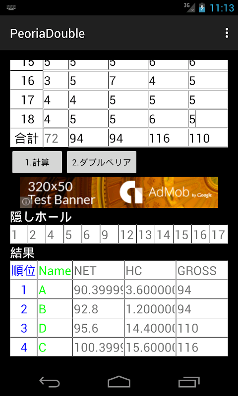 É um software para calcular o par duplo para usar em competição de golfe etc. Cálculo de peoria dupla macio. Está disponível para até 12 pessoas.