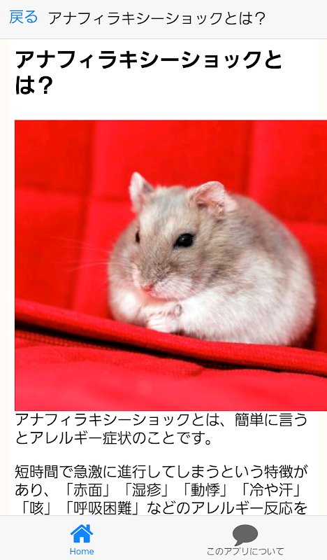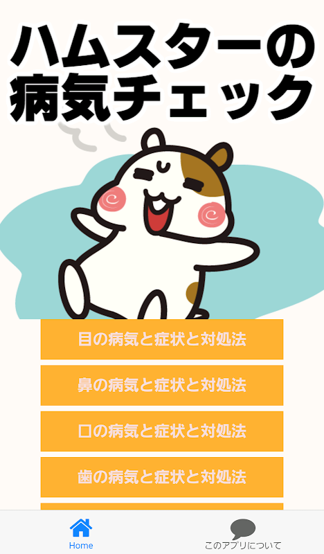 ハムスターの目・鼻・口・皮膚・歯・尿などの症状と対処法を紹介するアプリです。又かかりやすい病気や予防法。大切な命を守って幸せな生活を送らせてあげましょう。