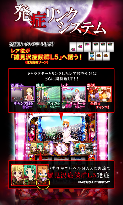 本機はキャラクターとリンクしているレア役の期待度がUPする「発症リンクシステム」と、消化中に惨劇回避率を上乗せするほど継続期待度がアップする惨劇回避型ART「DayBreak RUSH」を大きな特徴としており、惨劇を回避することで継続するARTと、2種類のリアルボーナスによって出玉を増やしていく仕組みとなっているぞ!