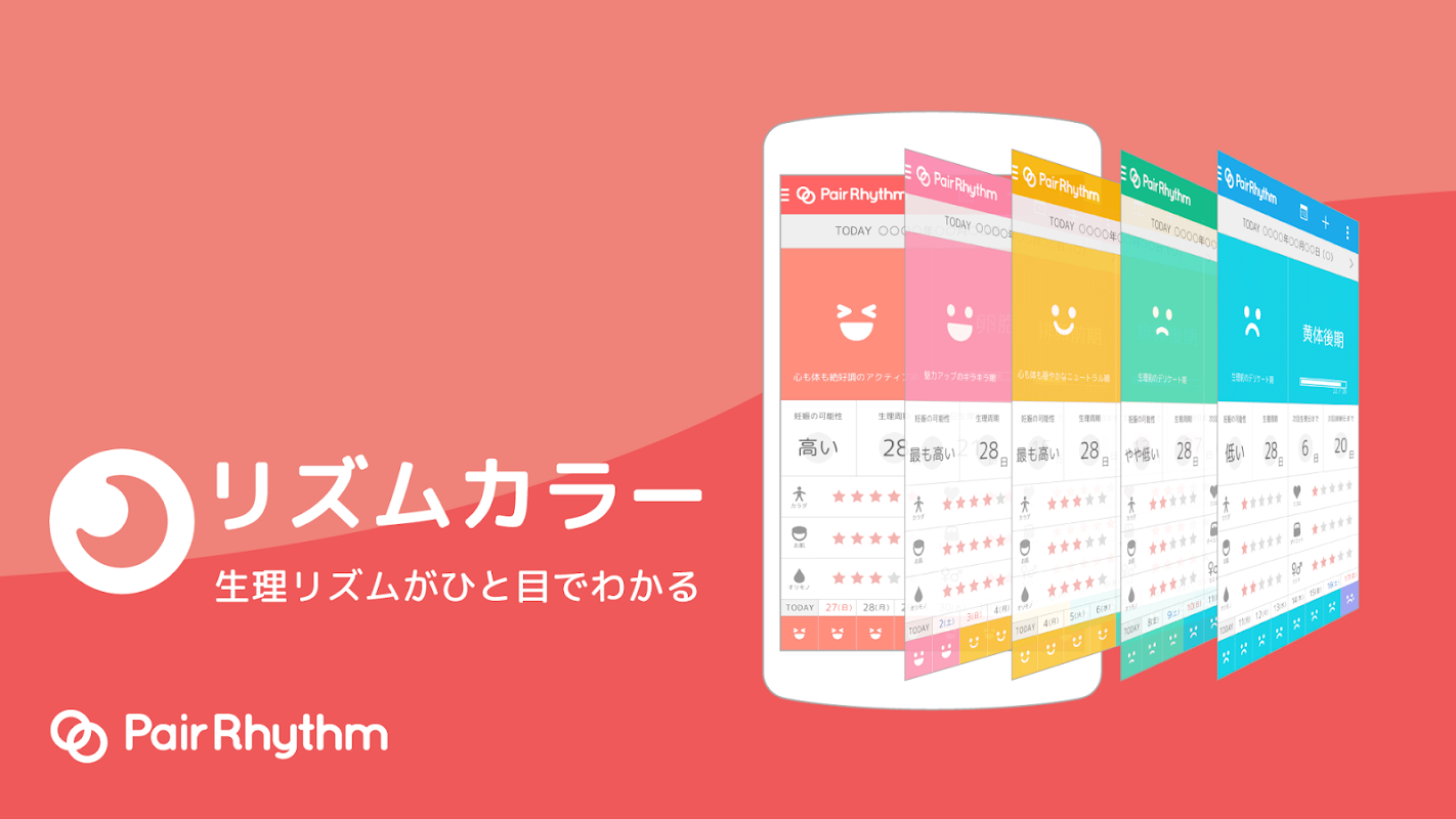ペアリズムは、生理周期を7つのステージに分割し、ココロとカラダのリズムをカラフルな「リズムカラー」で分かりやすく表示します。