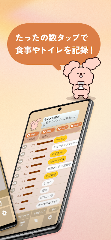"Raku Memo Intestinal Activity" redesenhou completamente o problemático processo de gravação. Complete seus registros de refeições e banheiros com apenas alguns toques. Você pode gravar antes ou depois das refeições, para não ser perturbado pelo seu próprio ritmo. Não há necessidade de tirar fotos de suas refeições como faria com aplicativos tradicionais.