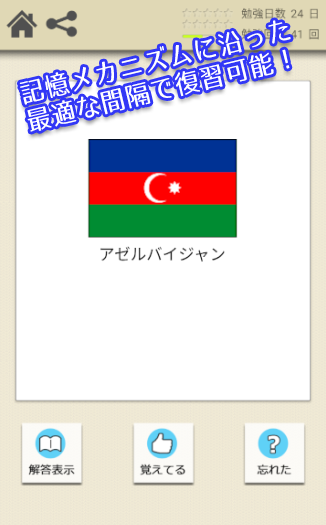 また、覚えていない国旗は何度も出題されるので、確実に記憶できます。