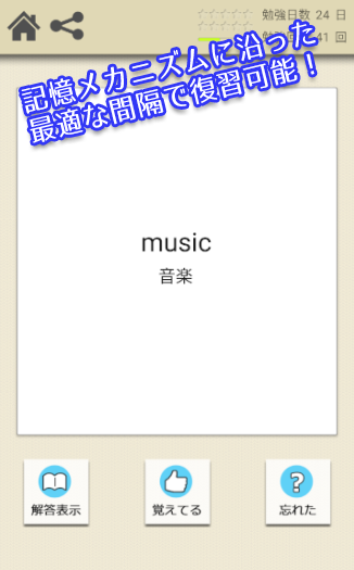 ・知らなかった単語は、覚えた程度によって復習間隔を徐々に長くすることでしっかりと長期記憶に定着させます。