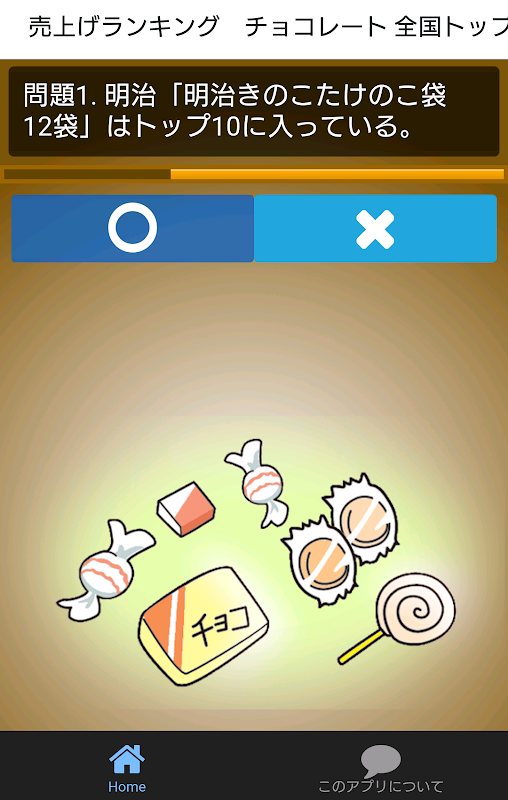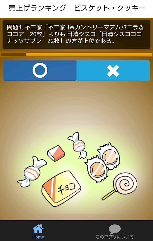 チョコレートやチューインガム、キャンディなどの身近なお菓子について売上げランキングをクイズにした無料アプリです。