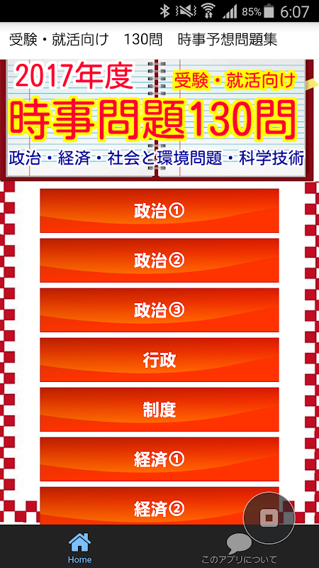 このアプリは就活と公務員試験向けの時事問題を問題集にした無料学習アプリです。 問題はどどーんと130問!ジャンルは経済から社会・環境問題まで7カテゴリー網羅!