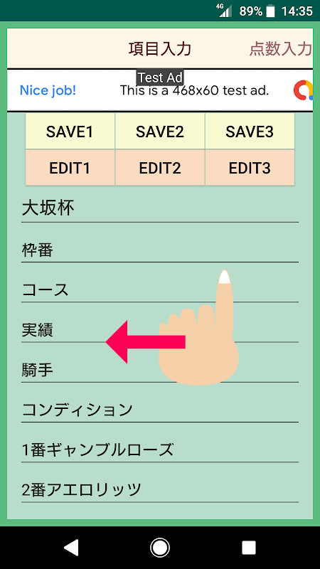 ◇ Toque na tela "Inserção de item" para inserir o nome da corrida, entrada e pontuação ◎ ○ ▲ Insira os materiais (número do quadro, adequação do curso, conquistas para corridas de cavalos).
