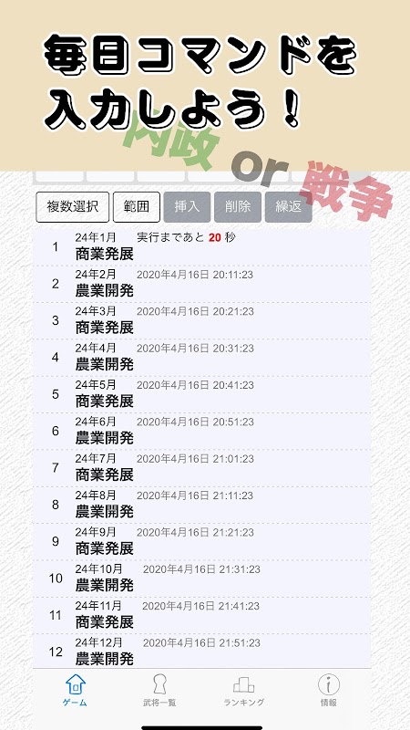 毎日コマンドを入力して、内政や戦争をして統一を目指そう!