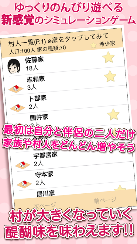 Esteja você interessado em sobrenomes ou não, este é um jogo onde você cria uma vila com seu sobrenome e cria a melhor vila do mundo. No ranking, você pode competir no desenvolvimento das aldeias e vilas mais fortes do Japão. Agora que as famílias estão ficando cada vez menores, vamos coletar diamantes para aumentar sua família e experimentar a verdadeira emoção de aumentar sua vila. Se você ganhar a eleição de cada prefeitura como governador de prefeitura, poderá obter uma atração turística representativa daquela terra! Você também pode estudar geografia enquanto joga.