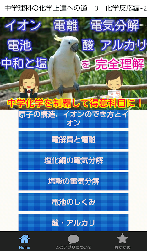 このアプリは中学の教科書で学習する化学を解りやすく解説し、いかにして得意科目にするかそのマスターへの道を解説した参考書のようなものです。