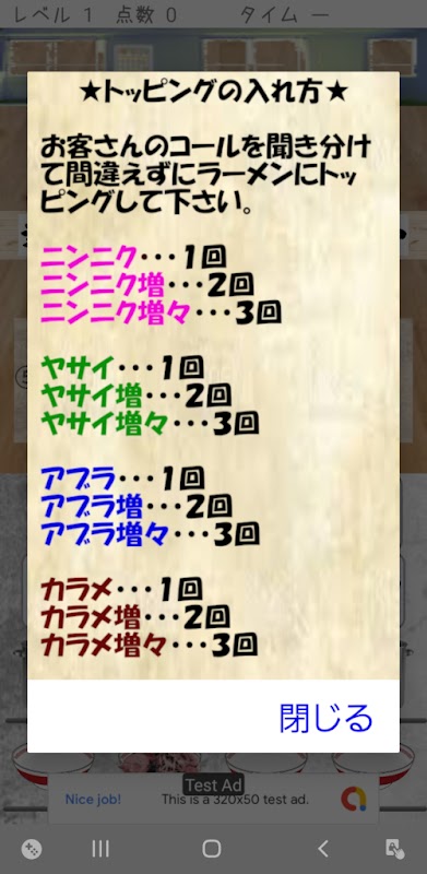 Um jogo que fornece ramen aos clientes, tornando-se a capacidade de Ramen Jiro. Vamos ouvir as coberturas que os clientes querem e fazer ramen sem errar! !!