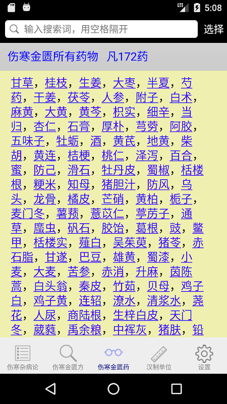 该应用以表格形式展示了伤寒论398条原文及113方内容,以及可选的金匮要略的内容,可以方便的过滤搜索条文以作研究,或者输入数字编号直接滑动到某条条文以作学习,搜索框还支持多关键字查询,只要以空格隔开就可以,还支持通配符搜索,不过通配符为“#”或“.“,搜索结果中关键字会被染红,方便观看结果。这比直接看书要方便很多,每条条文点击后会弹出一个菜单,可以选择做笔记,复制内容,或定位到条文中涉及的方药内容查看。