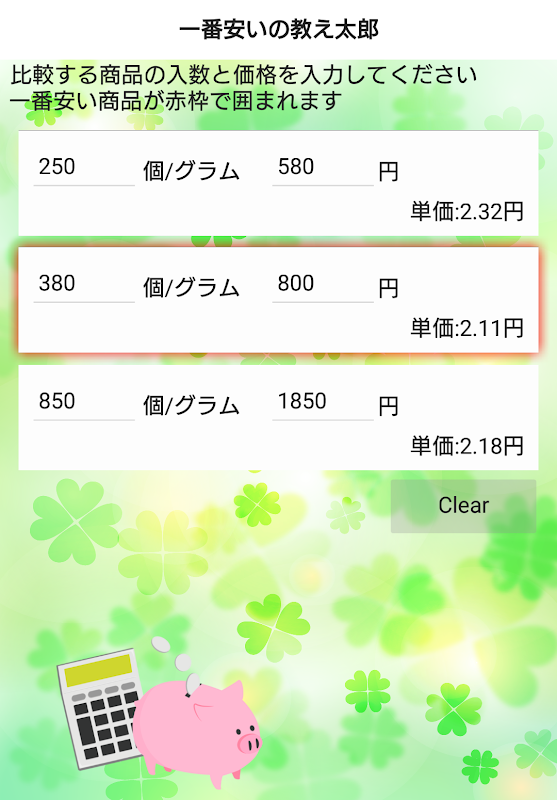 容量や入数が異なっている商品3つのうち、どれが安いのか比較するのが面倒な時に入数と価格を入力するだけで瞬時に単価が安い商品を教えてくれるアプリです。