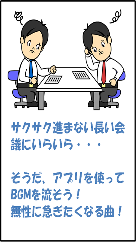 そのような情勢の中で、労働生産性向上・長時間労働に焦点を当て、このアプリは無駄に長い会議時間を短く終わらせるようなBGMを提供するジョークアプリでございます。