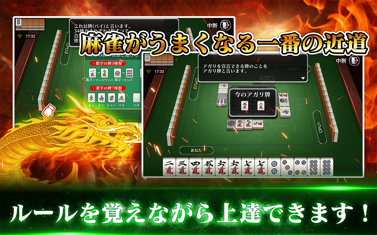 初心者の為の無料でずっと遊べて、点数計算もしてくれる人気麻雀アプリ。