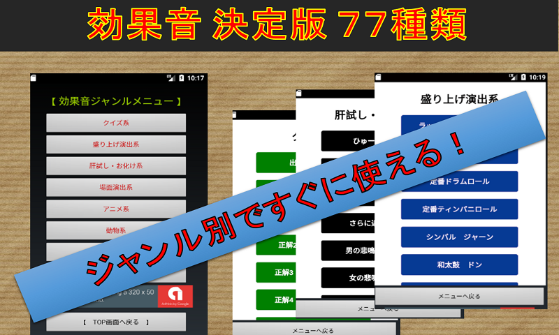 効果音77種類をアプリにて提供。 ジャンル別に効果音を振り分けてあるから使いやすい。 クイズ、宴会、肝試し、アニメ等、クリアなリアル音質ですぐに使える便利さ。