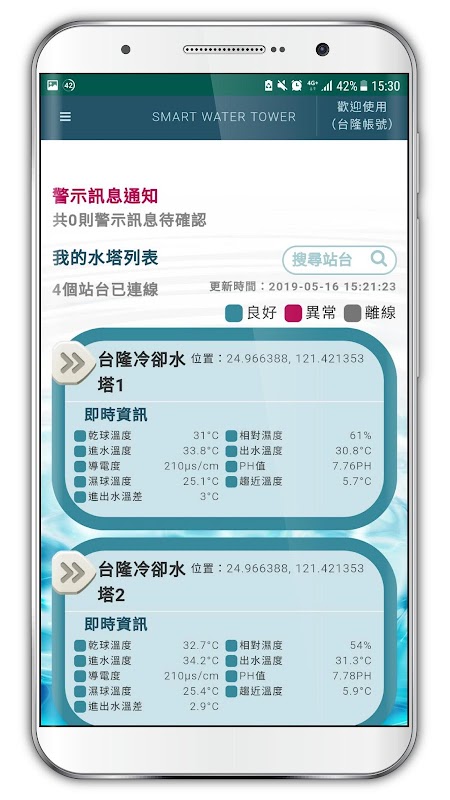 Através deste aplicativo, você pode fazer login no sistema Tailong Smart Cooling Tower. Os usuários podem visualizar dados remotos de qualidade da água por meio deste sistema e monitorar o status dos dados de qualidade da água.