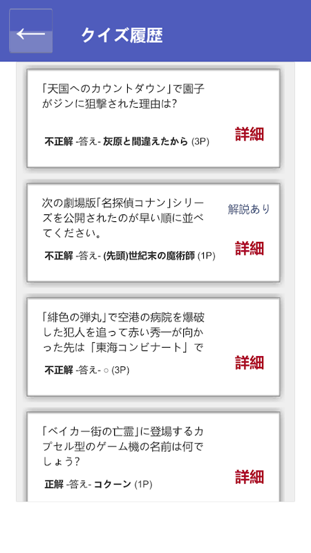 Um aplicativo de jogo de perguntas totalmente gratuito criado por fãs do Detetive Conan. Contém um grande número de questionários em vários formatos, como "questionário de classificação" e "questionário de perguntas e respostas".