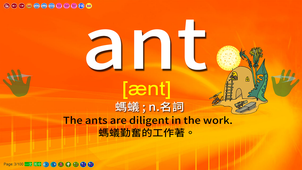 這個APP電子書是依據教育部所發佈的國中小學必學英語單字1200字編成,目前推出第2級包含1百個單字A到Z,.搭配音標,單字詞性和例句.真人發音可中英文隨意切換,每個單字都有精美示意圖檔讓你左右腦並用加強單字記憶.不僅可聽可讀還有螢幕書寫功能讓同學們邊聽邊動手寫.可依照單字字帖學習書寫單字,也可切換為空白底稿無聲默寫.或中英文語音切換依聽力默寫自我測驗,自動有聲播放可以讓你跟著老師發音一個個單字開口說.