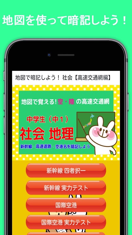 中学生向け勉強アプリで、中1で学習する社会の地理に関する問題集で無料アプリです。日本地図を使って空・陸の高速交通網を暗記しましょう。