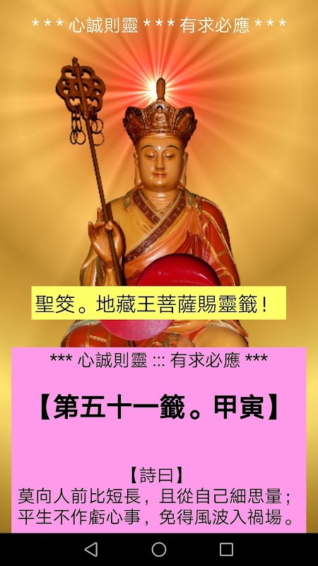 手機版《地藏王菩薩大靈籤》收錄了完整的60支靈籤。隨時隨地求籤解惑,趨吉避凶。心誠則靈,有求必應。