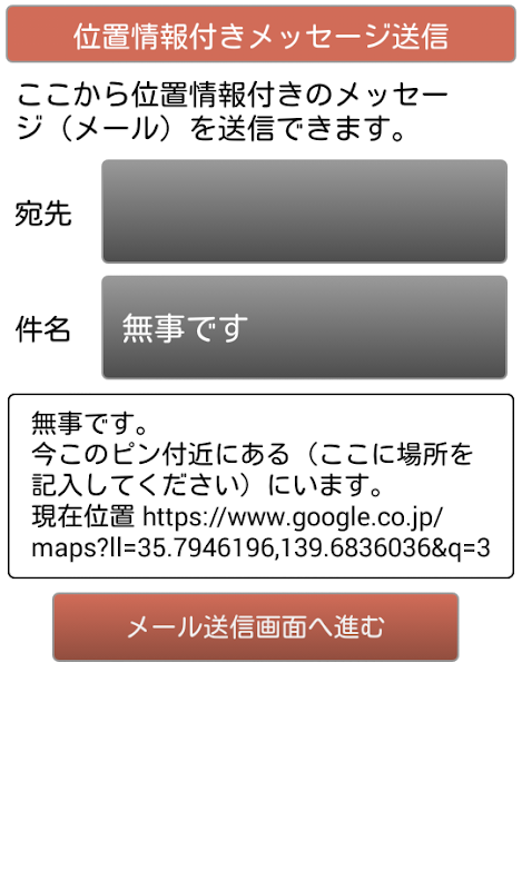 メールの内容は「無事です」など、テンプレートから選択でき、変更して送信することもできます。