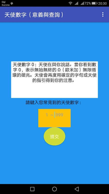 這是網上非常難得(也許是唯一的)能夠查詢中文正體字/繁體字天使數字意義的應用程式。本應用程式簡單實用,並收錄了 1 至 999 個天使數字的意義,供您查詢。(天使數字 0 已經呈現在首頁中。)