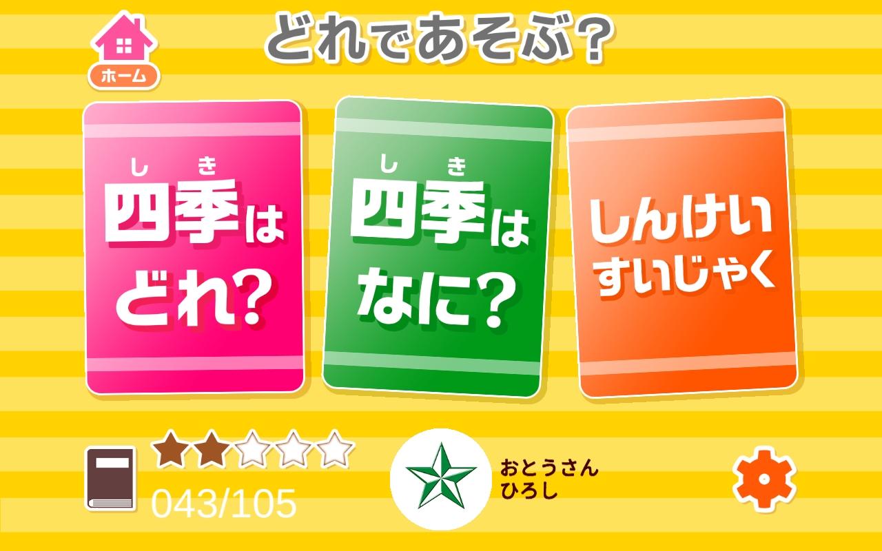 "Seasonal Cards" é um aplicativo que permite que você aprenda "palavras" relacionadas à estação de forma divertida enquanto joga quizzes e jogos de cartas. Também equipado com uma função de livro de imagens que acumula cartões sazonais quando você responde ao questionário.