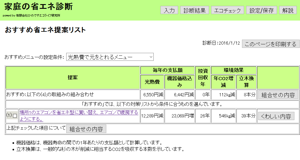 家庭の光熱費を平均と比べたり、冷暖房、給湯、照明、冷蔵庫などの分野での省エネ対策と、その効果を具体的に紹介することができます。