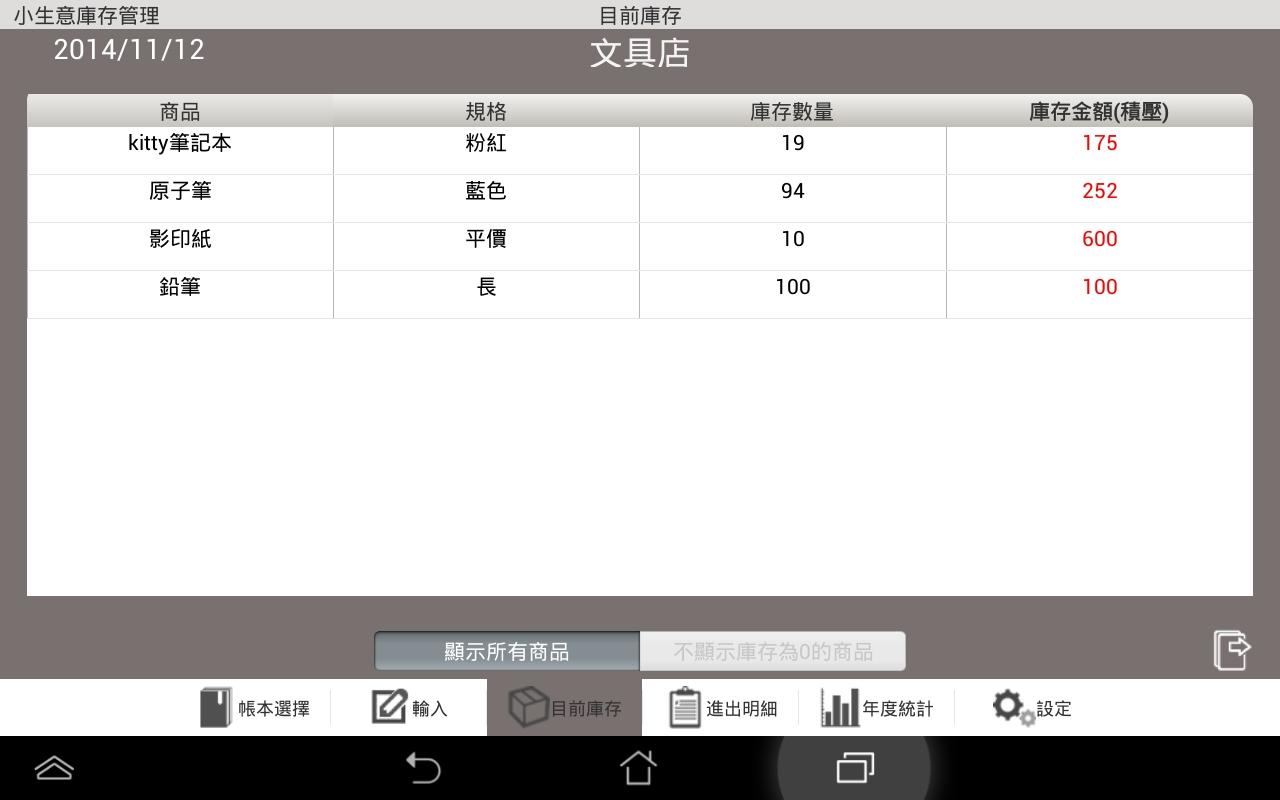 。「目前庫存」:列出目前所有商品的庫存量和金額。 一眼看出現有的商品庫存