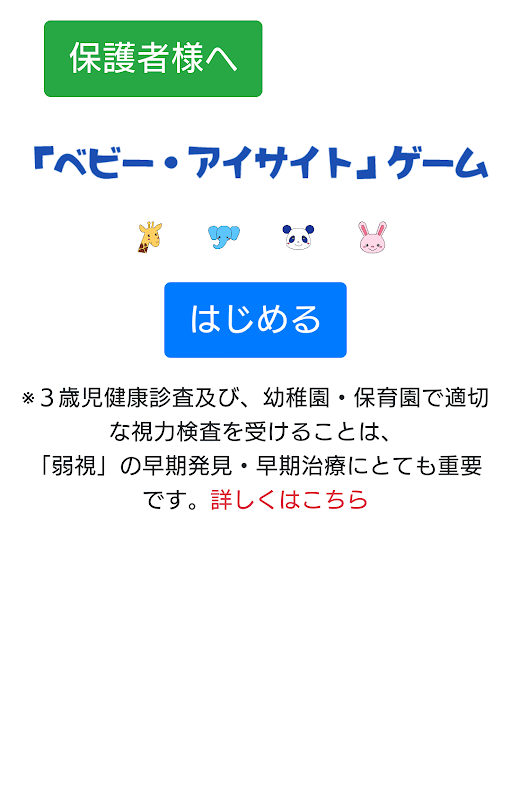 3歳、4歳、5歳児が、楽しく遊びながらゲーム感覚で、視力検査で利用されるランドルト環(C)の向きを、正しく回答できるように練習するゲームです。三歳児健康診査(家庭・会場)、幼稚園・保育園の健康診断で行われる視力検査の前までに「ベビー・アイサイト」ゲームで遊ぶことで検査への理解力が向上します。